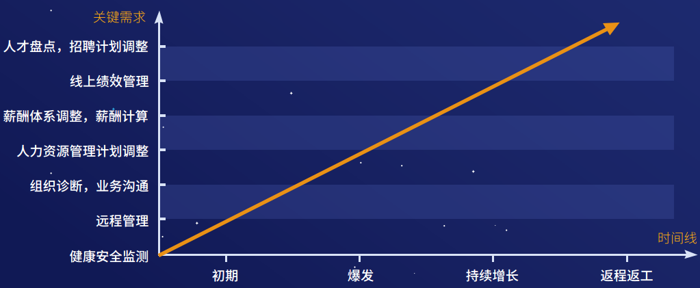 价值时间线路图以某企业为例,在疫情初期、爆发、持续增长和返程返工阶段,人力资源管理者的工作核心在不同情景下重点略有不同。总的来说,人力资源管理在这一阶段的主要目的就是提升组织的敏捷性和组织变革。