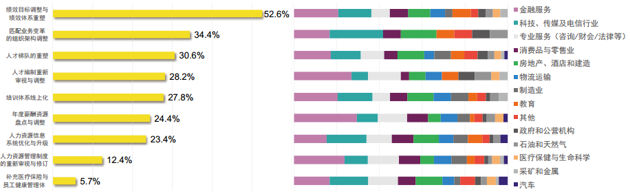 据安永调查,从整体来看,绩效目标调整与绩效体系重塑、匹配业务变革的组织架构调整、人才梯队的重塑、人才编制重新审视与调整、培训体系线上化,是疫情后企业人力资源管理的五大核心重点关注领域。其中,金融服务行业相比其他行业更加关注人力资源管理制度的重新审视与修订、年度薪酬资源盘点与调整;科技、传媒与电信行业相比其他行业更加关注补充医疗保险与员工健康管理体系优化。