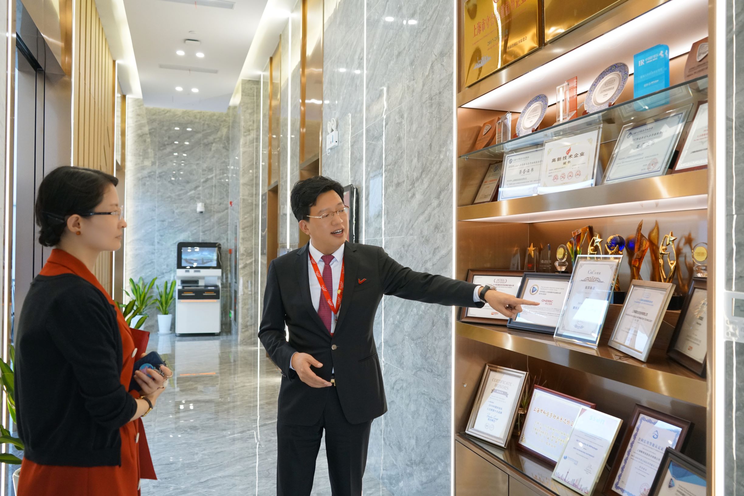 近日,上海市徐汇区发展和改革委员会、上海市徐汇区科技创新发展中心副主任杨晓洁一行,在上海市徐汇区营商服务中心虹梅分中心总经理王伟成等领导的陪同下,莅临位于徐汇区智慧产业栖息地——华鑫慧享城园区内的佩信集团总部视察,受到了等候在C7座总部一楼大厅的集团董事长张东进等高管的热情迎接。