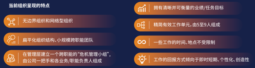 互联网时代组织变革有三个大方向:一是去中介化,组织向扁平化、平台化发展;二是去边界化,跨越组织内部边界,更加开放、透明、灵活;三是去权威化,组织与人的关系变成平等协同的合作伙伴关系,促进组织的横向管理、共享领导与集体合作。