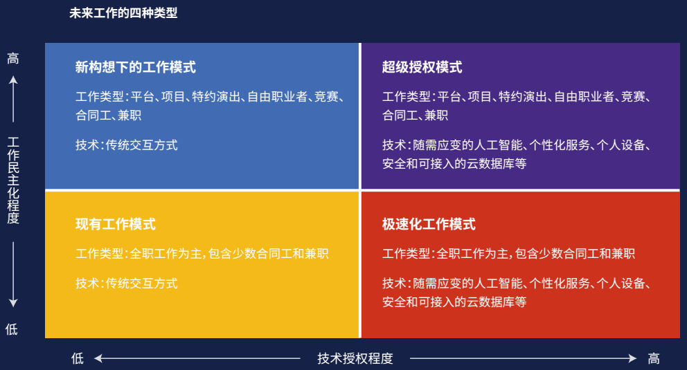 组织变革是改变自身组织架构、关系、流程的过程,同时也影响着人与组织、组织与组织、人与机器之间的关系。全球人力资源管理者联盟(CHREATE)根据工作的民主化程度和技术授权化程度,将工作分为四大象限。