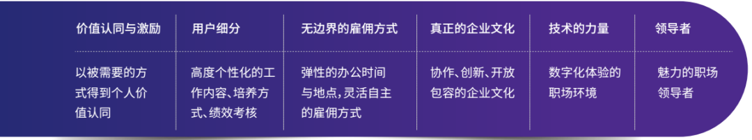 研究发现,95后对工作的期待包含了下表所呈现的价值认同、个性化需求、灵活弹性办公、包容文化、数字环境和魅力领导者等领域。