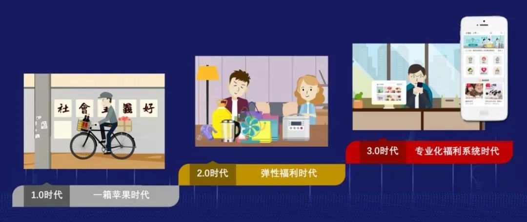 员工福利经历了3个时代,第一个是“一筐苹果”1.0时代,就是我们父辈领取一筐苹果的年代;第二个是弹性福利2.0时代,目前依然占据主流,大家之前看到的这种卡、券这样的产品就是,而3.0时代就是专业化福利系统时代,有很多企业在员工超过3000人,分公司布局超过5个城市的时候,就开始使用专业的福利系统进行员工福利发放。
