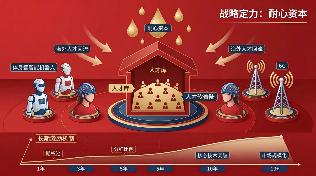 面对人才供应链挑战,企业不仅要引进国内高端人才,更要建立海外人才回流的“软着陆”机制,系统化设计从薪酬待遇到家庭安置的全方位方案。“耐心资本”对应的是“耐心人才战略”。新兴产业回报周期长,要求企业跳出短期考核功利主义,构建长期稳定的激励机制,确保在技术攻坚期拥有稳定的人才储备,实现“科技+人才”双轮驱动。