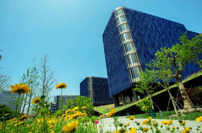 佩琪人才总部位于田林路200号的华鑫天地,整座办公楼被一层垂直叶片的外立面包裹起来,叶片两面印着不同的颜色,从楼的一面走到另外一面,墙体的颜色就从绿色变成了蓝色,与周围的灰色墙面形成了一种强烈的对比。