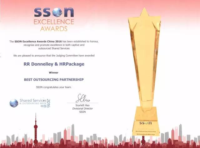 因佩琪人才(HRPackage)与客户的成功和愉快合作,凭借多年达成的完美服务水准,专业服务团队的付出和卓越的价值创新。2016年,经该美国500强的客户申请,经过全球共享服务和外包组织(SSON)的评估,佩琪人才(HRPackage)和该客户的合作被全球共享服务和外包组织(SSON)评为中国区共享服务中心外包合作伙伴冠军大奖。